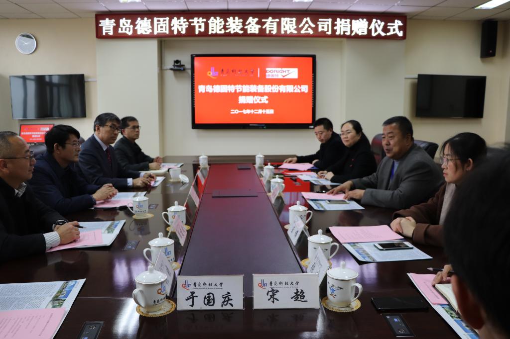 12月15日, 青岛德固特节能装备股份有限公司捐赠及科研合作签约仪式在4008会议室举行,校党委副书记张元利、胶州市科工信局副局长陈吉柱、青岛德固特节能装备有限公司董事长魏振文、副总经理崔…