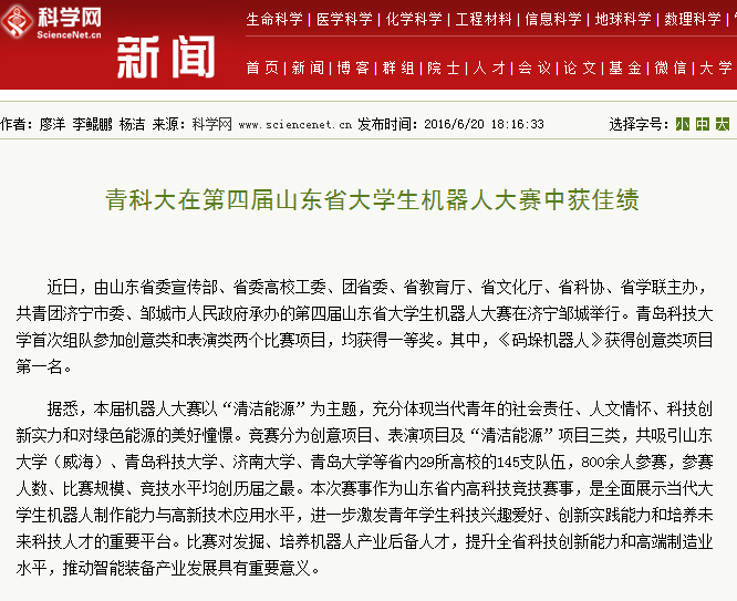 7月5日,山东省科学技术协会下发《关于表彰2016年山东省大学生优秀科技社团和优秀科技社团干部的决定》(鲁科协发〔2016〕27号),青岛科技大学机器人中心获评“山东省大学生优秀科技社团”称…