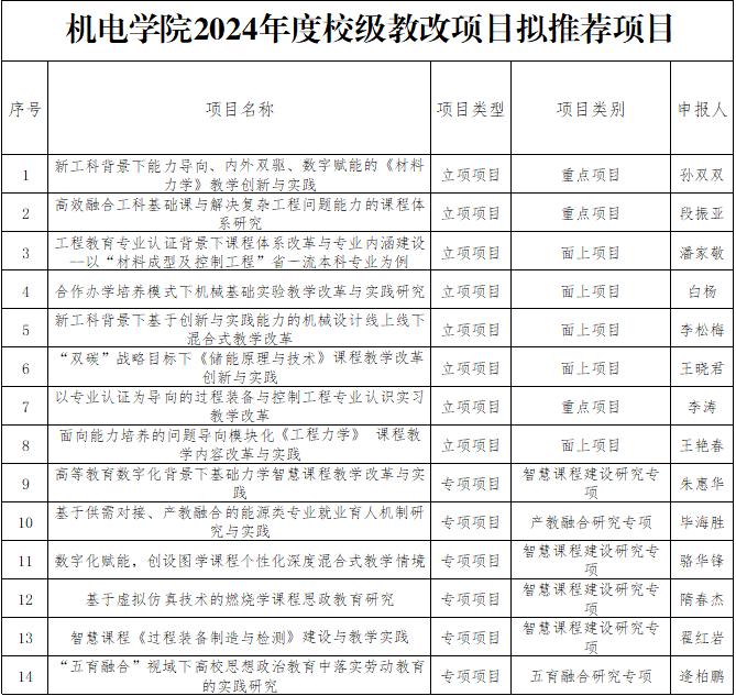 根据 磁力搜索 《关于开展2024年度校级本科教学改革研究项目和专项项目立项申报及2022年度项目结题工作的通知》要求, 磁力搜索 组织了项目评审和结题验收,经项目负责人申报,专家评审,通过验收准予结题14项,拟推荐至 磁力搜索 进一步评审项目(立项和专项)14项,现将结果公示。