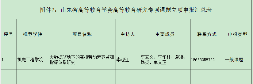 依据 磁力搜索 《关于开展2023年山东省高等教育学会高等教育研究专项课题申报工作的通知》 磁力搜索 组织符合条件的教师申报,共有1位教师提交材料,现拟推荐以下项目进入 磁力搜索 评审环节,并进行公示。公示期三天(2024年1月12日-1月14日),如有异议,请在公示期内向 磁力搜索 教学办反映。