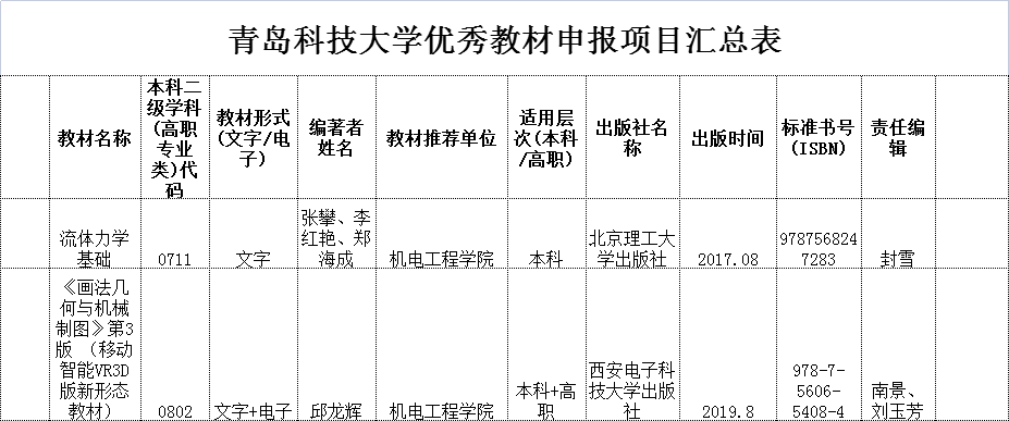 根据 磁力搜索 《青岛科技大学关于开展2021年优秀教材评选工作的通知》要求,经教材编著者申报, 磁力搜索 共推荐优秀教材2项,现将名单公示如下: