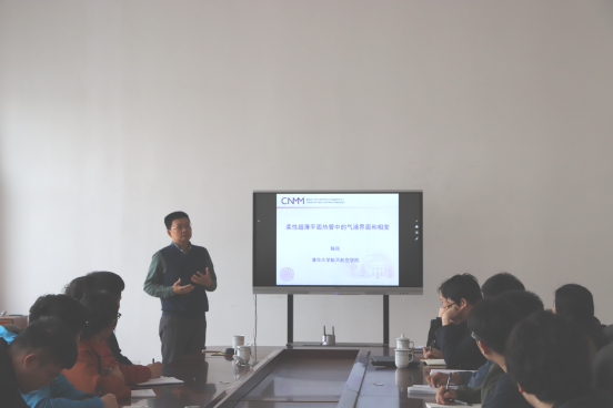 对陈民教授的到来表示热烈欢迎,并对陈民在相变传热和分子动力学模拟领域取得的重要成果做了介绍。随后,陈民做了题为《柔性超薄平面热管中的气液界面和相变》报告。报告中详细介绍了超薄热管的前沿科技并对热管中气液相变问题进行具体阐述,通过非平衡分子动力学模拟方法,得到相变物质在不同温度和非平衡程度下的凝结系数,根据HSK公式推导出可应用于CFS计算的蒸发凝结新模型,陈民还就分子动力学的应用领域和如何从工程实际中凝练出基础研究课题等问题为大家分享经验。会后,与会师生结合报告内容和自身科研过程中存在的问题与陈教授进行了深入探讨。