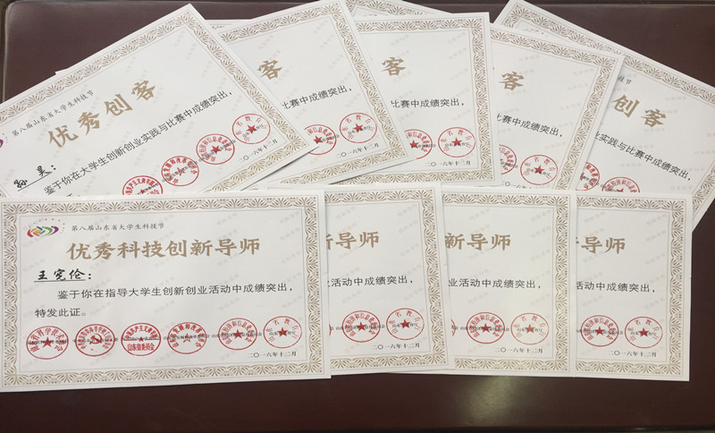 王宪伦等4名老师获山东省优秀科技创新导师称号,宋宏祥等5名学生获山东省大学生优秀创客称号。