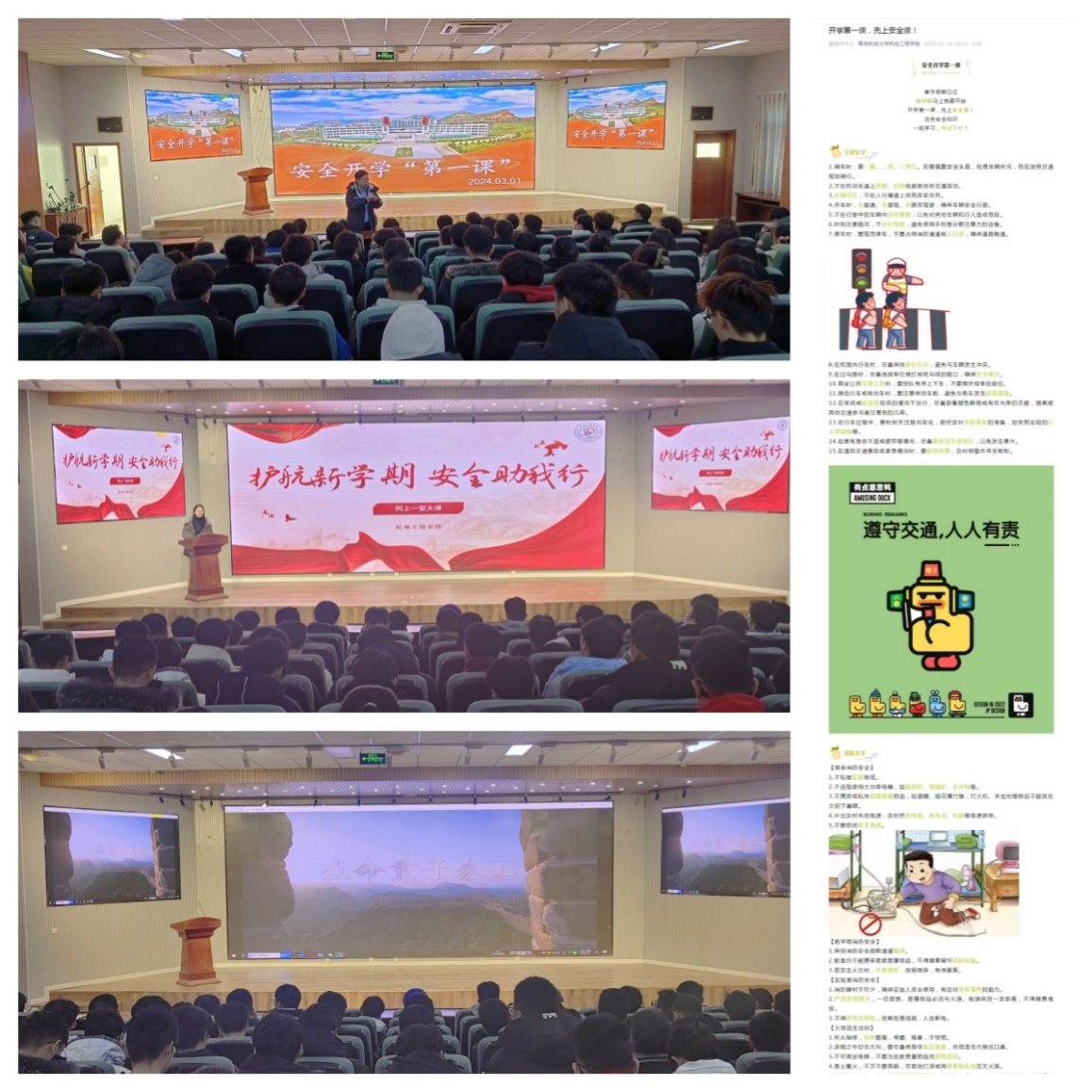 通过制作安全题材抖音短片、宣传图片和公众号推文等同步科普安全知识,推进安全主题教育。各年级、各教研室根据实际情况通过线上线下相结合的方式开展形式多样的安全第一课。