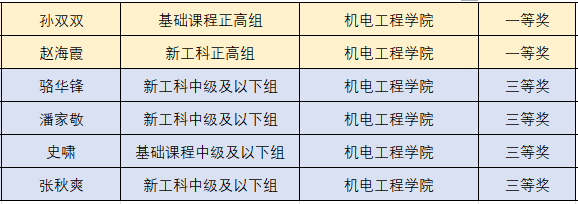 前期推荐的6名选手按照职称和类别,分在新工科组和基础课程组2个组别,经过网络评审和现场评审两个环节后,最终获奖情况如下: