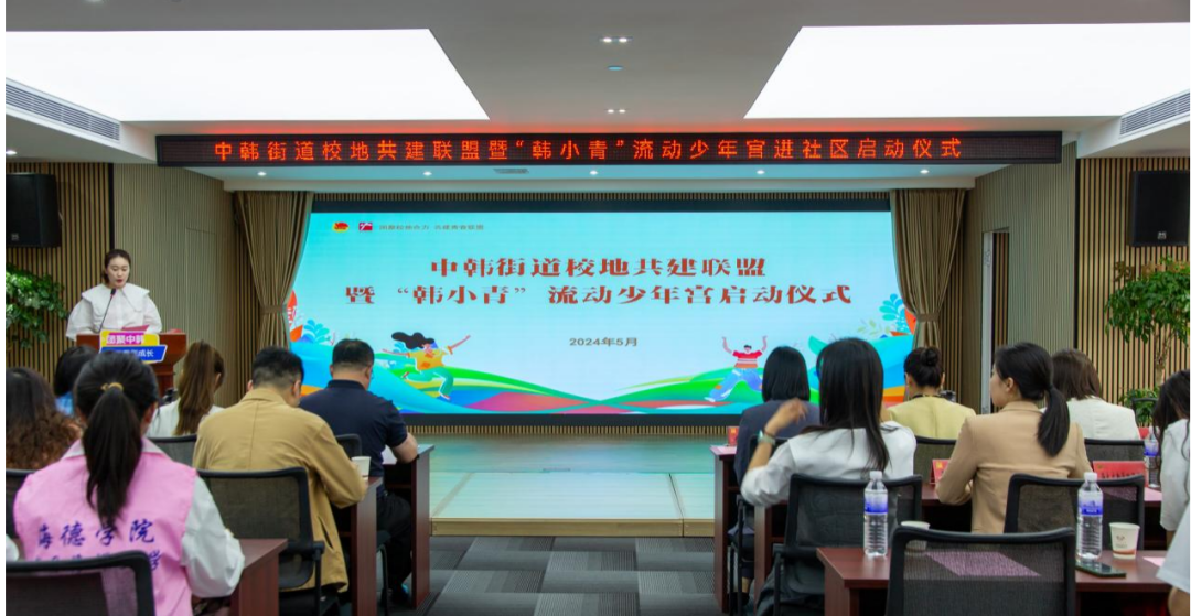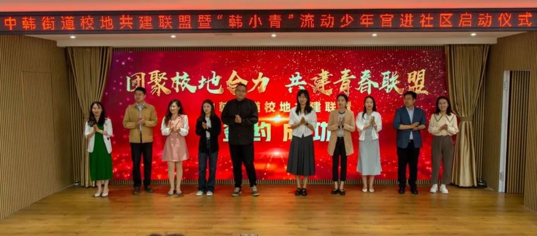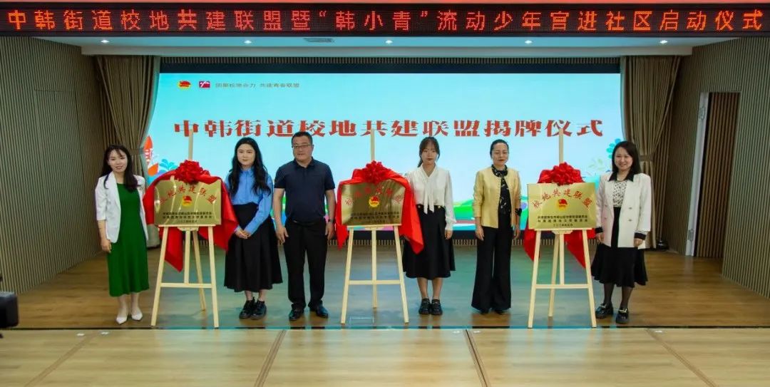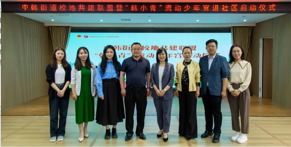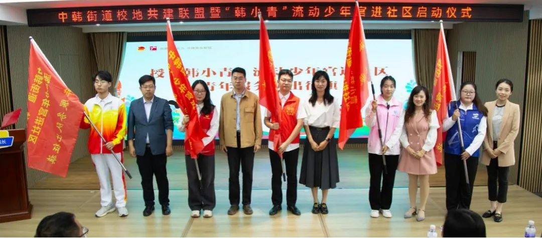 与中韩街道举行了校地共建签约仪式和揭牌仪式,讲解了“韩小青”流动少年宫项目,打造传统文化类、指尖文创类、腹有诗书类、艺术熏陶类、动感科技类、青春导航类形体礼仪类、法制宣传类、安全自护类少年宫课程,并对青年志愿者代表授予“韩小青”流动少年宫进社区青年服务队出征旗。