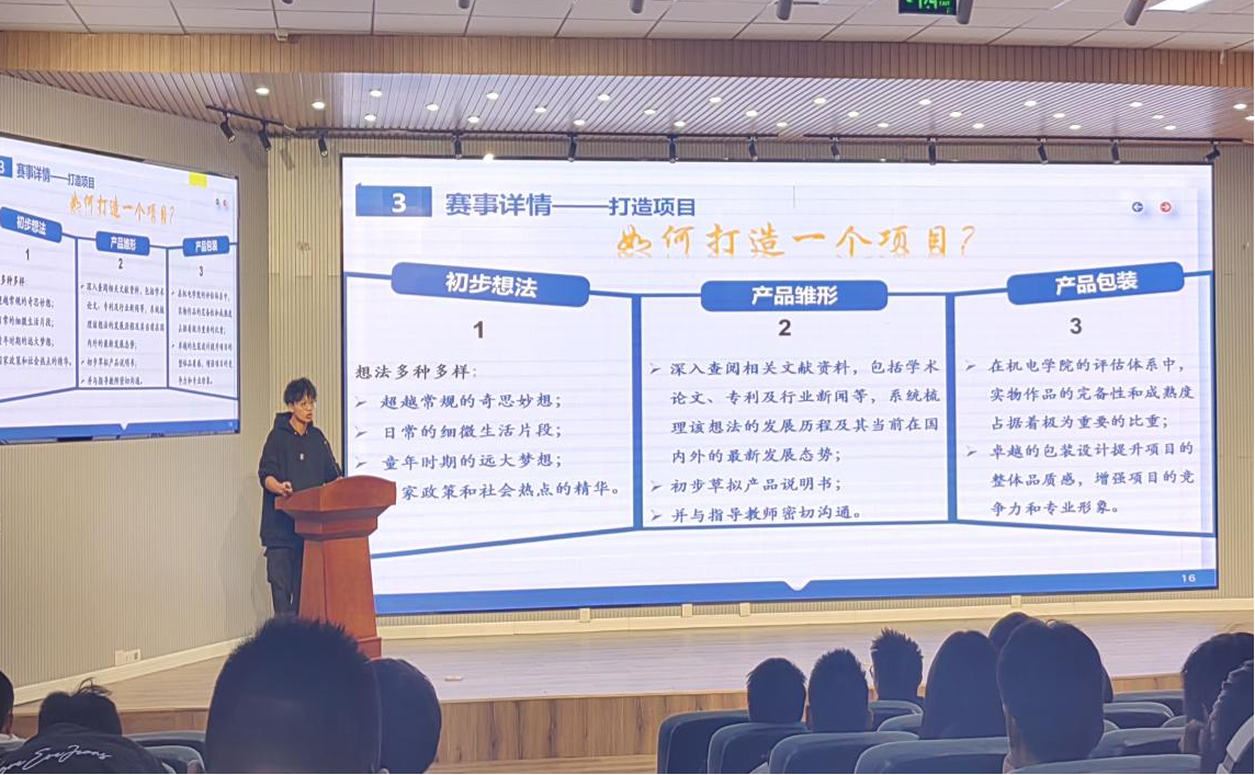 第二期讲座邀请了“海狼游艇工作室”指导教师杨奉儒担任主讲嘉宾。杨老师以其深厚的专业知识和独到见解,深入浅出地介绍了中国国际大学生创新大赛、“挑战杯”全国大学生课外学术科技作品竞赛等重要科创赛事。他详细阐述了赛事的背景、特点、流程以及评审标准,让同学们对这些赛事有了全面而清晰的认识。在分享过程中,杨老师结合自身指导学生参赛的丰富经历,讲述了在科创过程中的宝贵心得与感悟。他提到,科技创新不仅需要扎实的学术基础,更需要勇于探索、不懈实践的精神,鼓励同学们在面对困难与挑战时要坚持不懈,勇于突破自我。