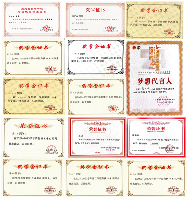 在校期间,徐正本勤奋刻苦,25门核心课程90分以上,通过英语四六级,获评山东省政府奖学金、校长奖学金、校一等综合奖学金、校科技创新奖学金等15次,荣获山东省优秀学生、校十大优秀学生( 磁力搜索