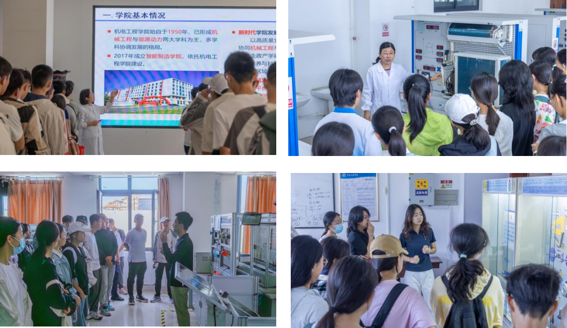 专业教师团队带领研学学生深入机械原理实验室、能源与动力工程实验室。在机械原理实验室,教师通过陈列柜中的平面连杆机构、运动副模型,用通俗易懂的语言讲解机械设计的底层逻辑,让新生直观理解“复杂工程源于基础结构”的专业内涵;在能源与动力工程实验室,讲解教师围绕制冷机组实验设备,拆解空调、制冷系统的工作原理,将热力学理论转化为可观察、可感知的生活实例,极大激发了新生的探究兴趣。