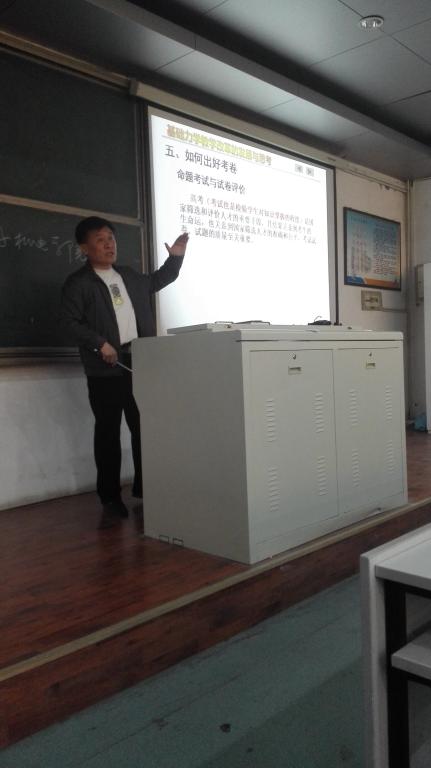 的现状给老师们讲解了教学改革中存在的问题和解决方法,然后重点从两方面给老师们做了讲解:一是如何上好一堂课,他认为首先要认真备课不打无准备之仗,合理地组织教学内容,重视教案的作用,处理好本课程和先修课后续课之间的衔接。讲课时要注意板书和多媒体的结合,培养学生的学习兴趣。二是如何出好试卷,为要重视试卷的质量,一份好的试卷应该有难度、区分度、信度和效度。最后王老师跟青年教师分享了工作中的体会和感受,他提出,青年教师应努力学习、勤于总结、肯于吃苦,做事要有计划、讲诚信、保持平衡的心态,要想事、干事、成事。会后王永岩老师与青年教师进行了热烈交流和讨论。
