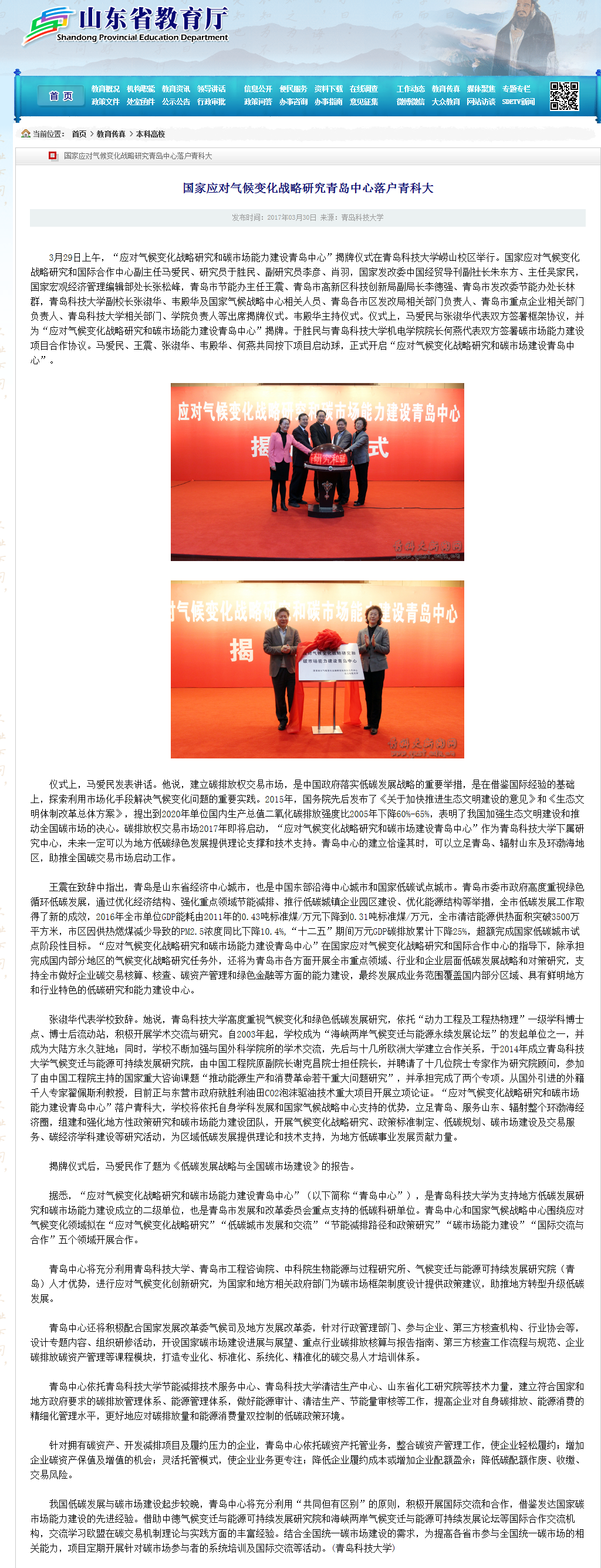【山东省教育厅】国家应对气候变化战略研究青岛中心落户青科大