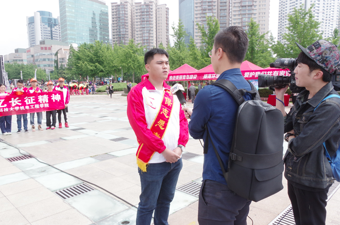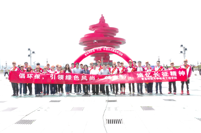 出发,徒步行至青岛市五四广场,进行环保宣传。志愿者们手持环保标语的横幅,不时向沿途的市民们宣传环保知识和节约理念。遇到丢在地上的垃圾杂物,志愿者们也会及时捡起,丢入自备的垃圾袋中。在志愿者们步行到达五四广场后,受到了市环保局副局长唐季礼、宣教中心主任赫旭的接见,并与岛城著名环保公益人士“青岛环保哥”王德洋进行环保志愿活动的交流,最后亲切合影。向广大市民展示了当代大学生的风采,赢得普遍赞誉。
