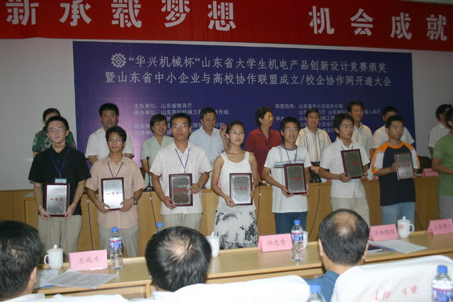举行的“2007年“华兴机械杯”山东省大学生机电产品创新设计竞赛”决赛。此次竞赛由山东省教育厅主办、山东高校机械工程教学协作组承办,以“绿色、环保、安全、和谐”为主题,全省共有来自山东大学、中国石油大学等50余所高校6000余名师生参加比赛,预赛作品达1200余件,涉及机械、电子、车辆、化工、纺织、轻工等行业,经过各高校评比,共推选出290个作品参加此次决赛。