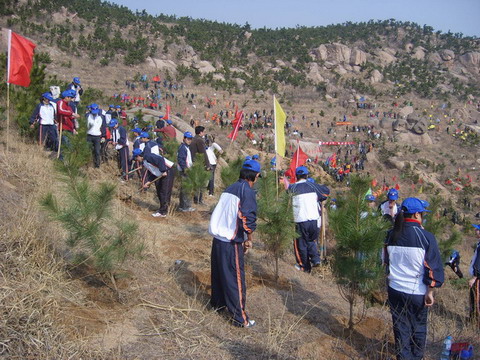 的团员青年参加了山东省“迎绿色奥运,建和谐家园”活动暨青岛市“绿色奥运志愿者林”建设活动。上午9时,师生到达崂山区北宅街道周戈庄水库西山。植树现场,他们有的挖坑、有的放苗、有的扶树、有的填土、有的夯实……大家互相配合着,场面空前热闹、繁忙。经过一个上午的奋战,2000多棵树直立在崂山共青团林,在山风吹拂中迎风摇曳,呈现出勃勃生机。