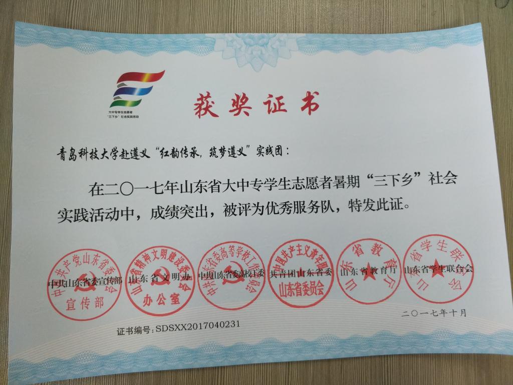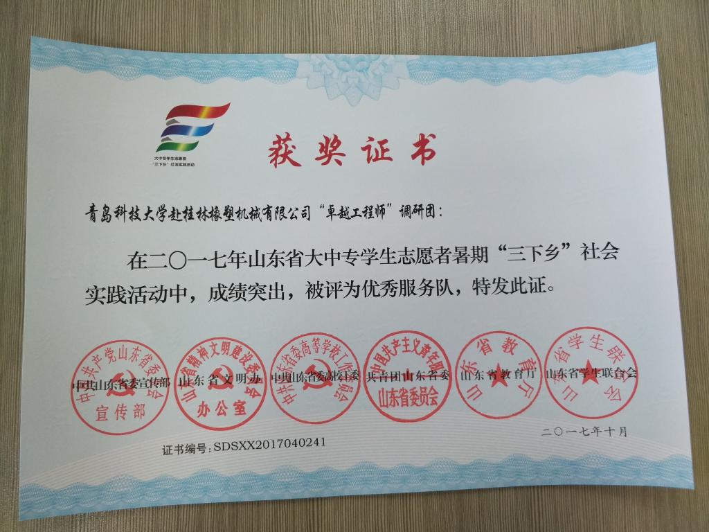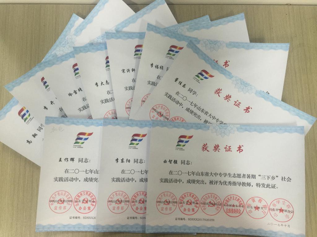 近日,2017年山东省大中专学生志愿者暑期文化科技卫生“三下乡”社会实践活动先进集体和先进个人的证书下发, 磁力搜索 赴桂林橡塑机械有限公司“卓越工程师”调研团、赴遵义“红韵传承,筑梦遵义”实践团2支队伍获得2017年山东省优秀服务队称号,王作辉、曲智强、李东阳被评为2017年山东省社会实践活动优秀指导教师,高翔、李开、冷雪靖、李大志、宋沂轩、李福祯、董佳乐7名学生荣获2017年山东省社会实践活动优秀学生。
