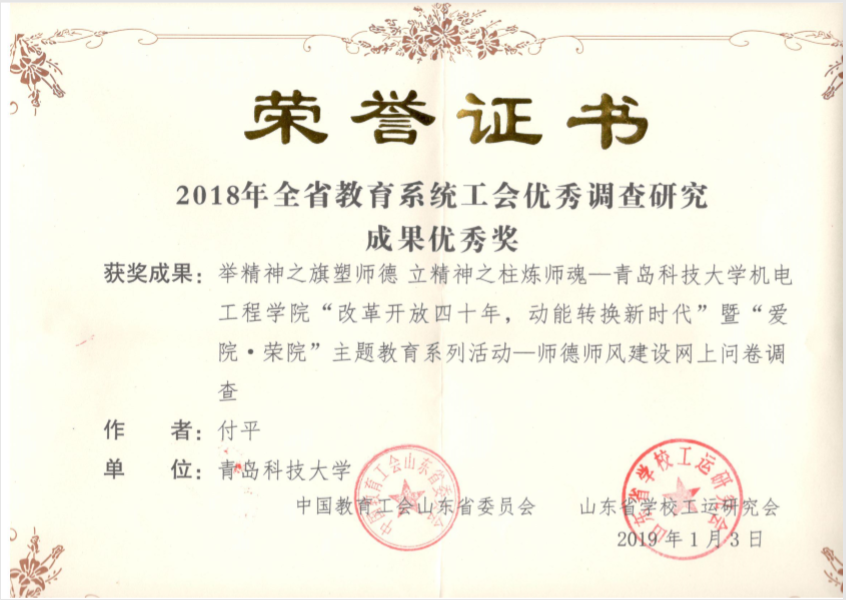 “改革开放四十周年,动能转换新时代”暨“爱院·荣院”主题教育系列活动---师德师风建设网上问卷调查》在全省100多项作品中脱颖而出,获得2018年全省教育系统工会优秀调查研究成果优秀奖。
