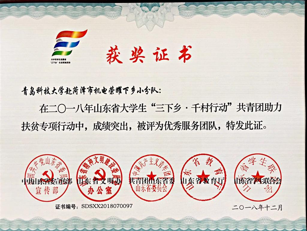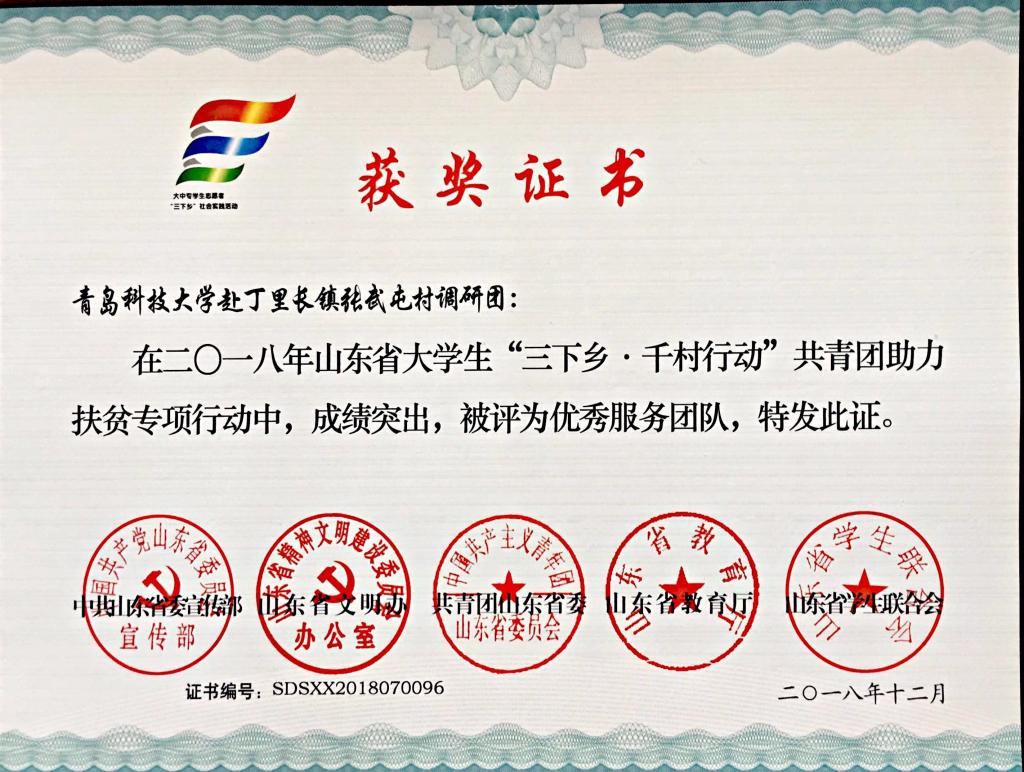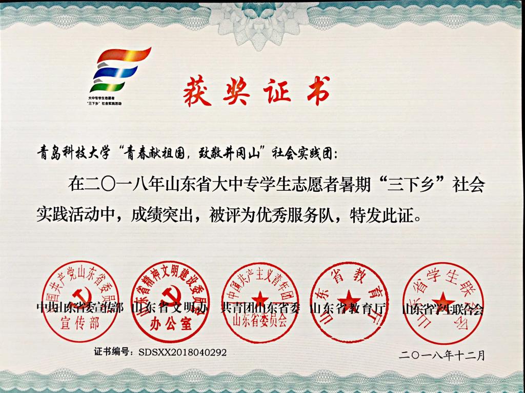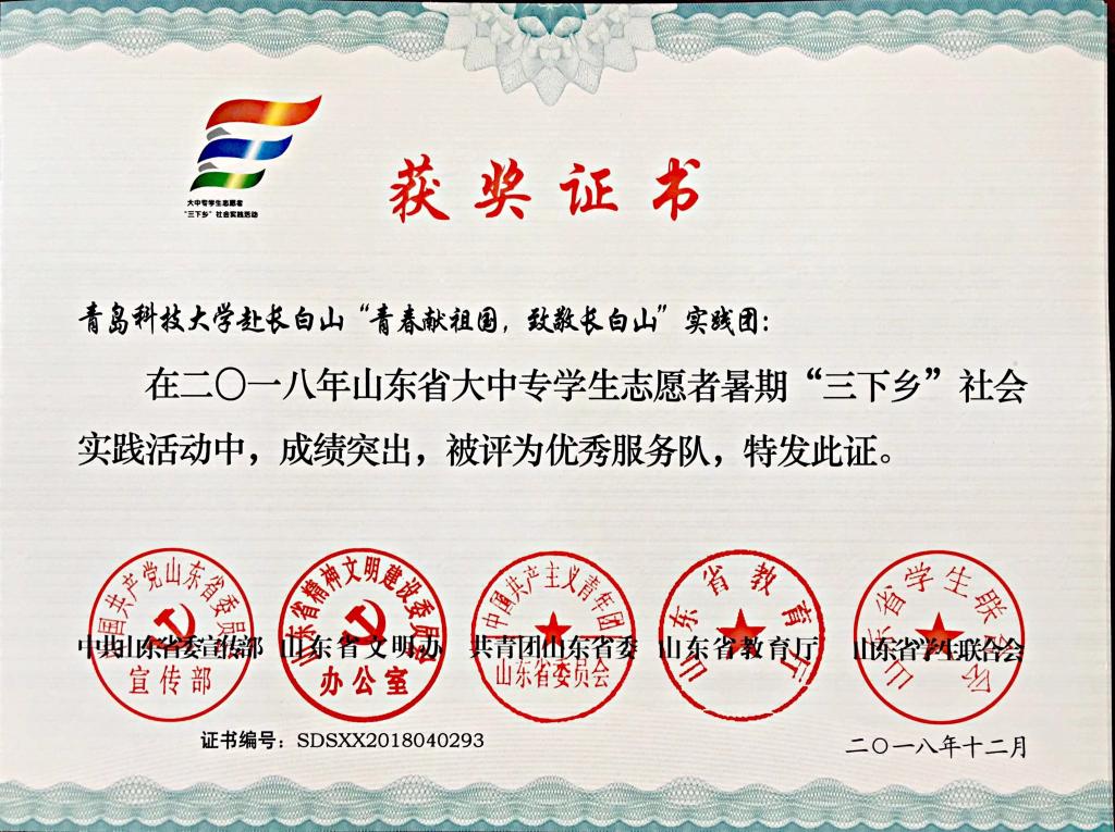 “青岛科技大学赴长白山‘青春献祖国 致敬长白山’实践团” “青岛科技大学赴长白山‘青春献祖国 致敬井冈山’实践团”获“三下乡”社会实践省级优秀服务队, “青岛科技大学赴菏泽市机电荣耀下乡小分队”、“青岛科技大学赴丁里长镇张武屯村调研团”获“三下乡·千村行动”共青团助力扶贫专项行动省级优秀服务团队,曲智强、李东阳获 “三下乡·千村行动”共青团助力扶贫专项行动社会实践活动优秀指导教师,王娟娟、苗清获“三下乡”社会实践活动优秀指导教师,毕岚森等多名学生获 “三下乡”社会实践优秀学生。
