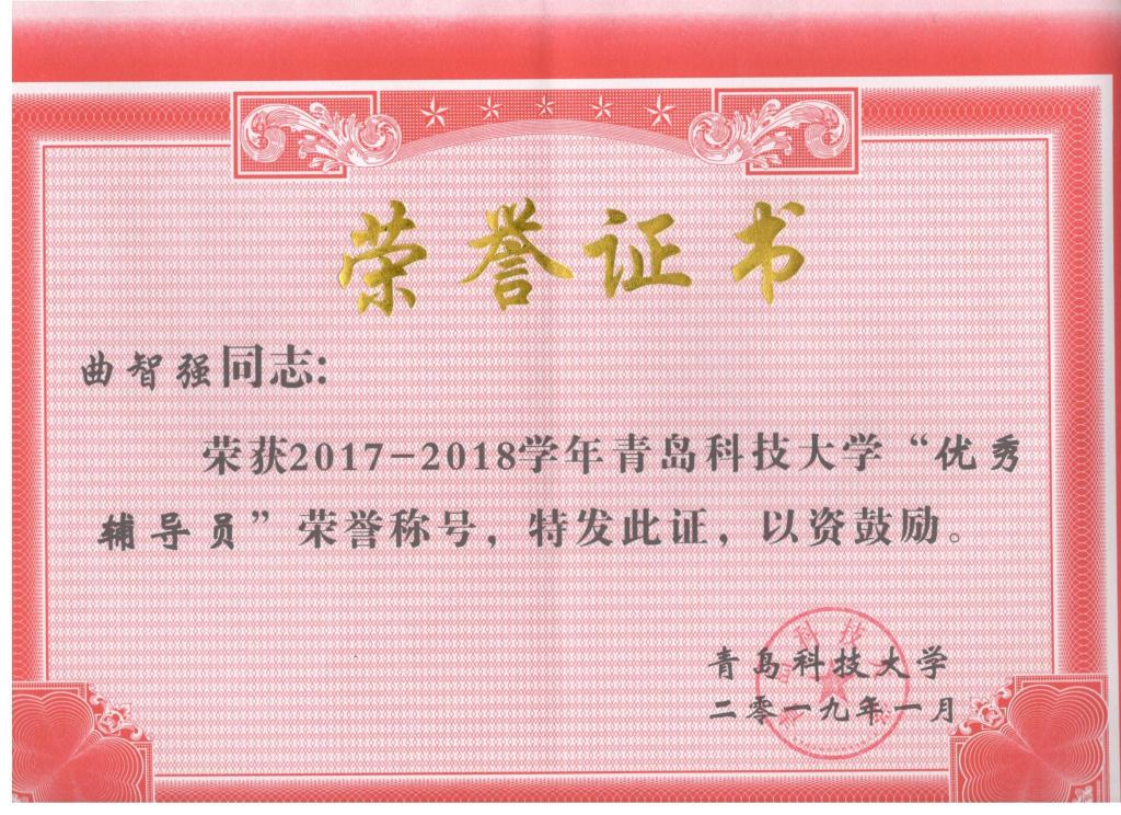 考核评定,最终评选出曲智强等18名同志为青岛科技大学2018年度优秀辅导员。