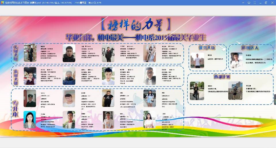 最美毕业生引领榜样之风】为进一步挖掘机电系毕业生中的先进典型,展示毕业生风采,机电系开展“毕业有你,机电最美”2019届最美毕业生评选活动。评选出靳磊磊等在专业学习、科技创新、社会实践、基层服务等方面表现突出的最美毕业生。同时,举行最美毕业生宣讲,分享榜样学生的经验,切实发挥榜样引领作用。