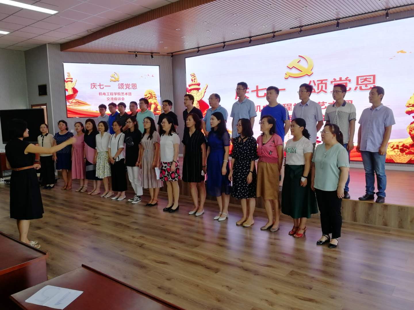 分工会工作的支持并献唱《潇洒走一回》,王帅老师深情现场《我的祖国》,院党总支书记孙立军清唱《呼伦贝尔》并寄语在座各位老师一是要不忘党恩,不忘初心,一心跟党走;二是要有信心、培养兴趣爱好,陶冶情操,形成良好氛围。最后座谈会在集体高唱《歌唱祖国》与《没有共产党就没有新中国》中结束。