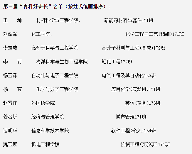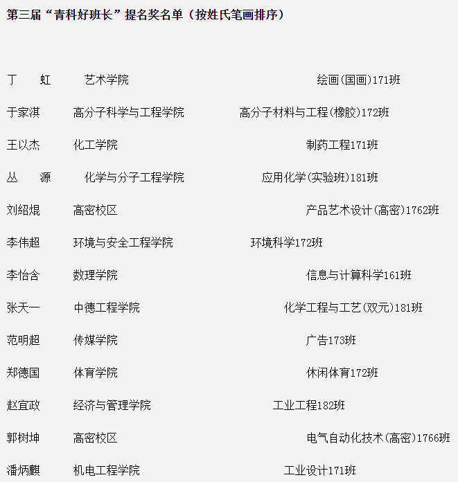 公布的青岛科技大学第三届“青科好班长”评选结果中,机械工程(实验班)171班魏玉展荣获第三届“青科好班长”,工业设计171班潘炳麒荣获第三届“青科好班长”提名奖。