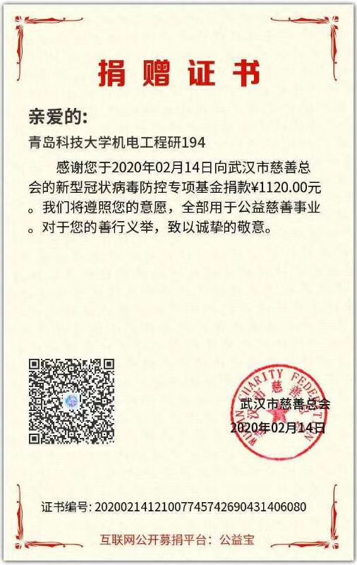 “战‘疫’路上,有你有我,一路同行。”青春战‘疫’的样子还有很多,装控162班崔苏宁同学看到疫情肆虐却急缺口罩、防护服等医用物资时,他心急如焚,用自己的压岁钱向武汉儿童医院捐助4套防护服。省建档立卡户王聪也捐出100元善款,他说:“一方有难八方支援,受到社会帮助的他也应该学会帮助他人”。研究生6个班级共同用自己的压岁钱、积攒的零花钱向武汉慈善总会捐款,为支援“战疫”前线尽一份微薄之力。在防控疫情的关键时刻,机电学子活跃在各个基层,机械中韩164班初梦珠、机械(3+4)161班李世杰、装控183班马江儒、机智181王瑞恒、新能源181马元宇、机械中韩182邵兆坤、机械173班朱洪阳看到家乡防控人手不够,纷纷主动报名参加防控志愿活动,积极投身这场没有硝烟的战场中,用实际行动体现一代青年的责任与担当。