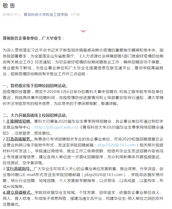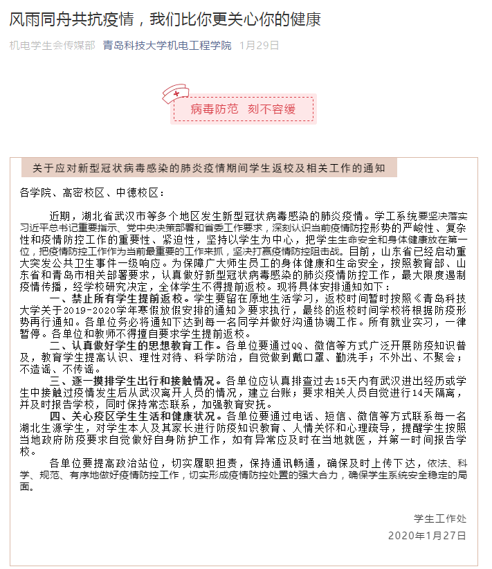 成立了疫情防控小组,按照职责分工,依法依规有序推进疫情防控工作,严格执行“日报告、零报告”制度,精确摸排掌握易感师生群体,密切追踪并随时掌握广大师生员工的健康状况。学工队伍每日对37名湖北籍及途经湖北的学生进行密切跟踪,并做好人文关怀、心理疏导,确保每一位机电学子都平安健康。为了“停课不停教、停课不停学”,不影响每一个学子的学习生活,各系老师纷纷主动运用线上教学优势,学习线上教学,保证学生需求。面临就业季,带毕业生的老师也开始线上对即将毕业同学开展一对一就业辅导、发布就业信息,在线帮助同学完善修改简历、不断推进高端就业。通过开展在线心理咨询辅导,为学生开展远程心理援助。