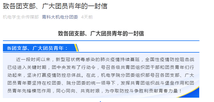 分团委组织部发表《致各团支部、广大团员的一封信》,号召各团支部、广大团员青年要坚持在校团委、院分团委的统一领导下,发挥共青团组织战斗堡垒作用和团员青年先锋模范作用,同心同向、共克时艰,为夺取防控斗争胜利贡献青春力量!号召机电学子服从指挥有纪律、正确发声有作为、履行职责有担当、网络学习由效率。 磁力搜索