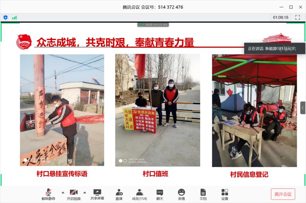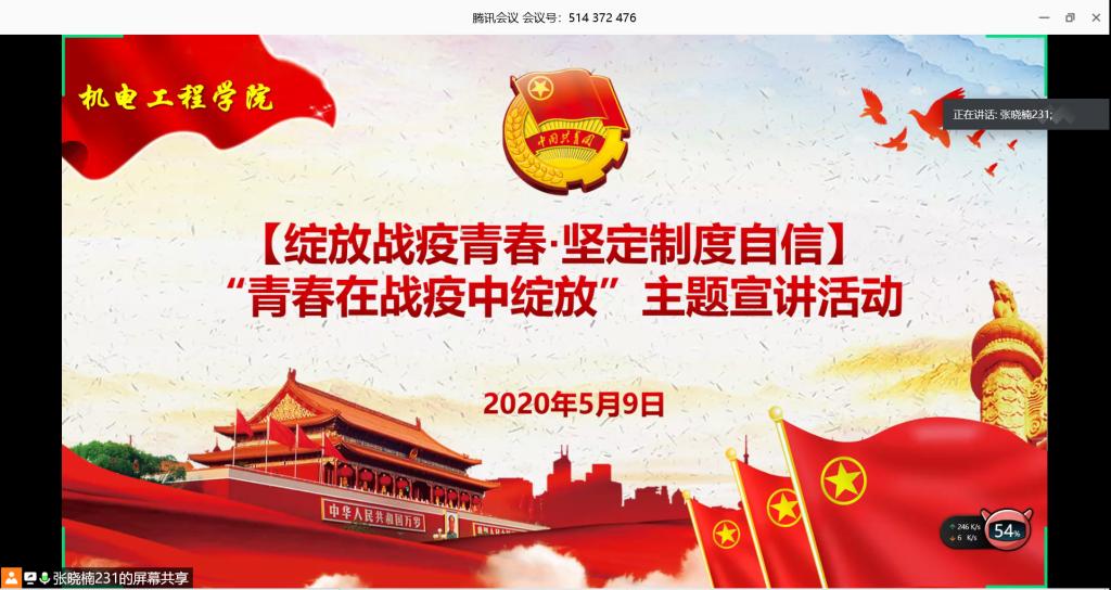 分团委组织部举办“青春在战疫中绽放”线上主题宣讲活动。分团委组织部部长王娟娟老师出席了活动,罗浩宇、刘龙、马江儒和马元宇四位团员作为机电团员青年战疫典型代表宣讲了他们勇战疫情的青春故事,17级、18级、19级200余名团学骨干通过“腾讯会议”参与了活动。活动由分团委组织部副部长张晓楠主持。
