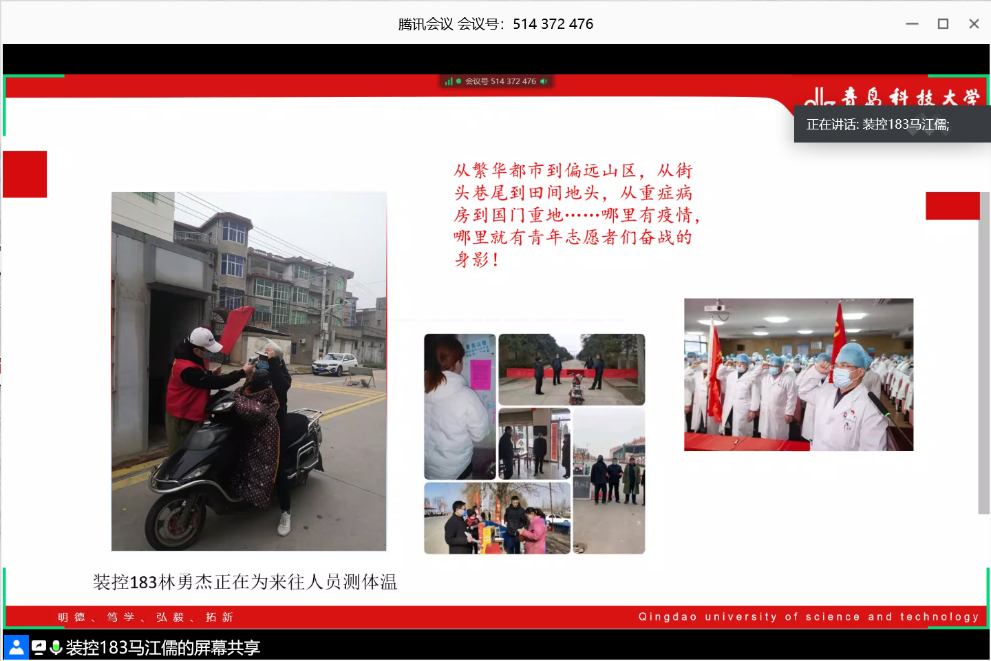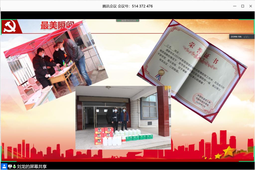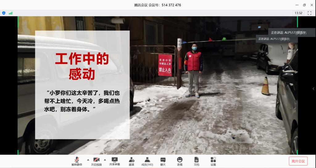 刘龙通过自己的志愿经历讲解了作为一名新时代新青年应有的责任和担当。国家的希望在于青年,民族的未来在于青年,新时代青年应厚植家国情怀,立足使命担当,心系人民幸福,心念祖国安康。青春短暂,宅家不宅心,自律更自强,面对疫情期间的感人事迹不只有热泪盈眶,更有作为新青年脚踏实地的作为。