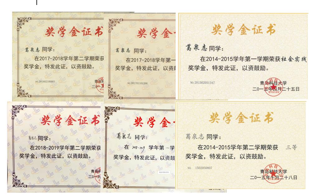 “学习之星”荣誉称号、6次校三等奖学金,3次校社会实践奖学金。