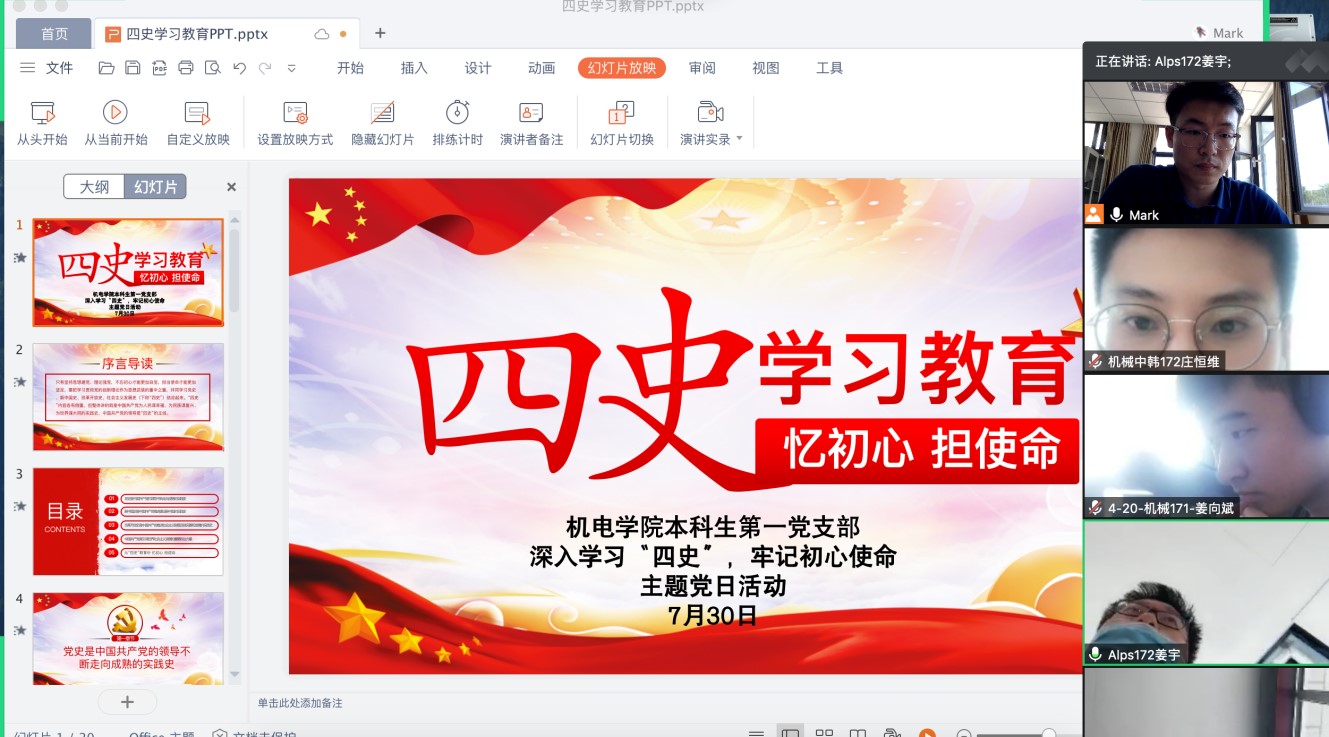 本科生第一党支部召开了主题为“深入学习四史,牢记初心使命”的线上主题党日活动。本科生第一党支部全体党员参会。会议由王玉凯老师主持。