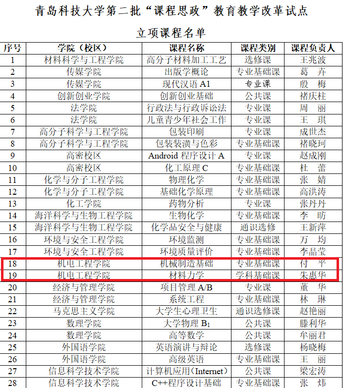 付平老师的《机械制造基础》与朱惠华老师的《材料力学》两门课程荣获立项。
