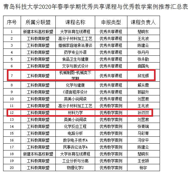 推荐、专家评审,最终评选出青岛科技大学2020年春季学期优秀共享课程10门、优秀教学案例10个。