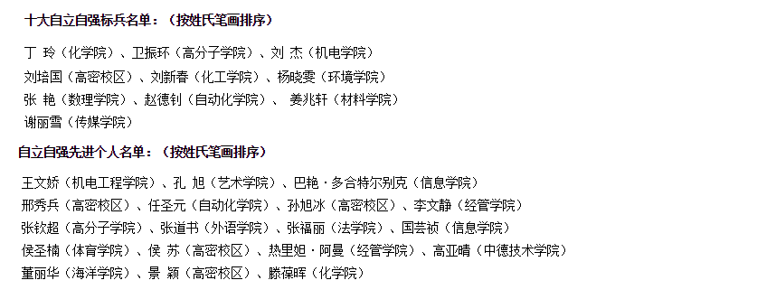 机械181班刘杰同学荣获“十大自立自强标兵”,新能源182班王文娇同学获得“自立自强先进个人”。