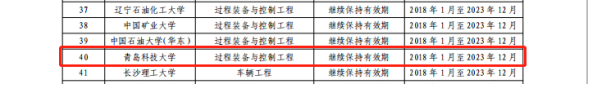 机械工程和过程装备与控制工程两个专业在列,审核结论为“继续保持有效期”,本轮认证有效期为“2018年1月至2023年12月”。