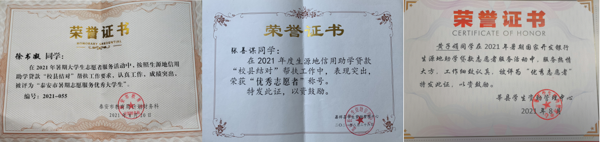 “校县结对”志愿服务中,志愿服务学生认真协助县(市)区资助中心进行国家生源地助学贷款工作,对贷款学生和家长的咨询和遇到的问题给予耐心解答,认真仔细对各项材料进行审核和申报,充分展现当代青年学生“请党放心 强国有我”的精神面貌,受到了县区资助中心和学生家长的一致好评,其中张善谋等3人被用人单位评为“优秀志愿者”、“暑期志愿服务优秀大学生”。