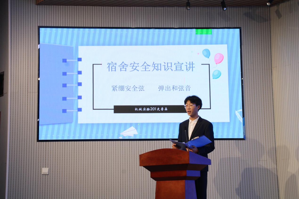 机械实验201班史普晶为全体同学进行宿舍安全知识宣讲,从宿舍消防安全、财产安全、人身安全等方面强调了宿舍安全的重要性,提醒同学们要牢固树立宿舍安全意识。