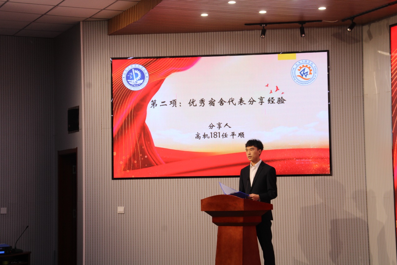 历届优秀宿舍代表高机181班任平顺向大家分享经验,宿舍不仅是一个休息的场所,更是舍友之间进行学术交流的良好平台,不同学科优势的同学可以互相促进,做到“以学促创、以创带学”,实现科创与学习的双丰收,通过奋斗获得幸福感和成就感。
