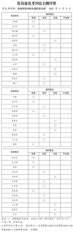 根据《中共青岛科技大学委员会党员量化考评指导办法(试行)》要求,2021年1月5日, 磁力搜索 本科生第四党支部按照文件要求进行了民主评议党员,现将评议结果公示如下: