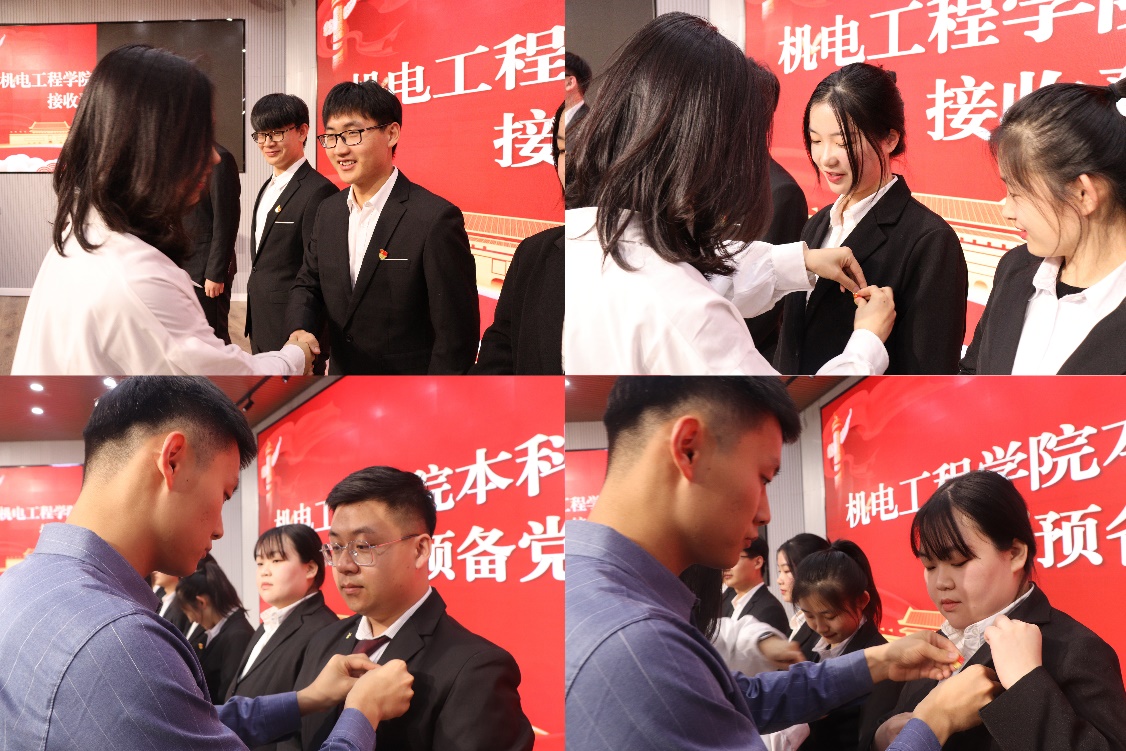 孙坤岩、管羽代表支部向新加入的9名同志表示祝贺,并为其佩戴党员徽章。同志们经过不懈努力顺利加入党组织,激动喜悦的心情溢于言表。