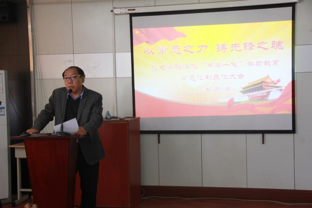 党总支副书记兼副院长王伟传达了《关于推进“两学一做”学习教育常态化制度化的意见》,并从明确基本目标要求、精心安排学习内容等八个方面带领党员进行学习。