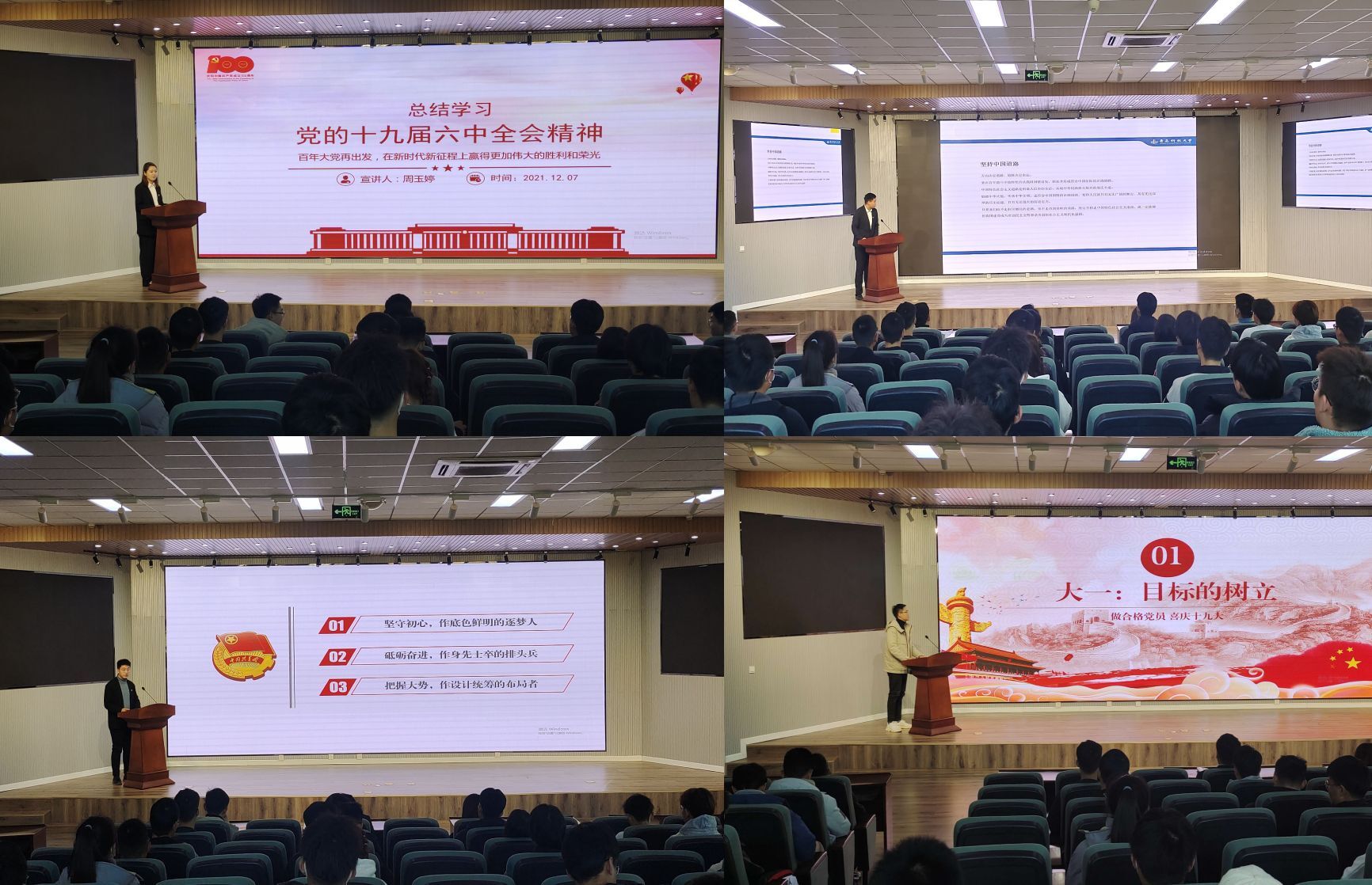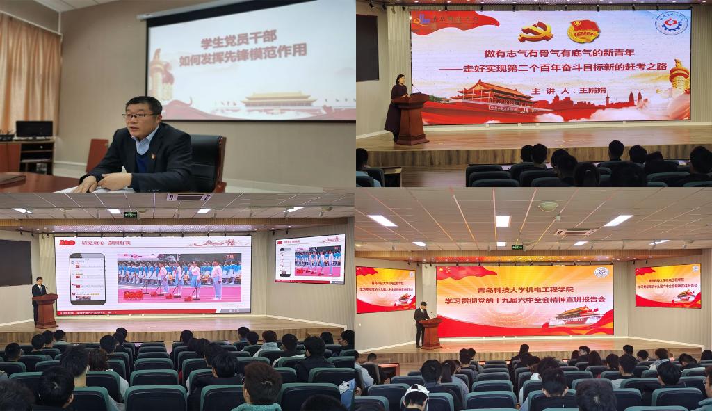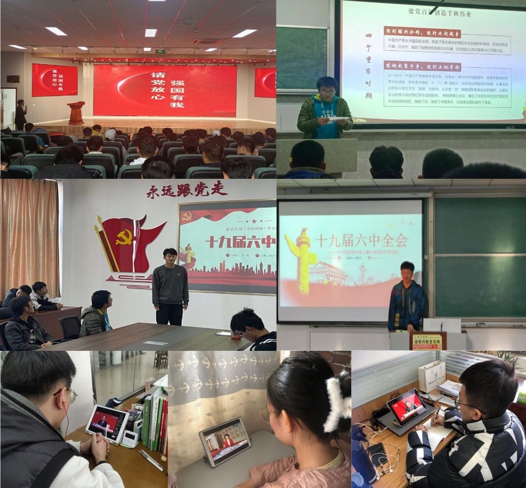 党的十九届六中全会精神宣讲团以《勇担复兴大任,书写青春答卷》《宏伟蓝图鼓舞人心,奋勇前进凝聚力量》《做有志气、有骨气、有底气的新时代青年》等为主题,以“百年成就”“十大历史经验”为主线,带领青年学生深入学习贯彻党的十九届六中全会精神,各党支部开展“感悟全会精神,激发奋进力量”主题党日,在实践中入脑走实走深。