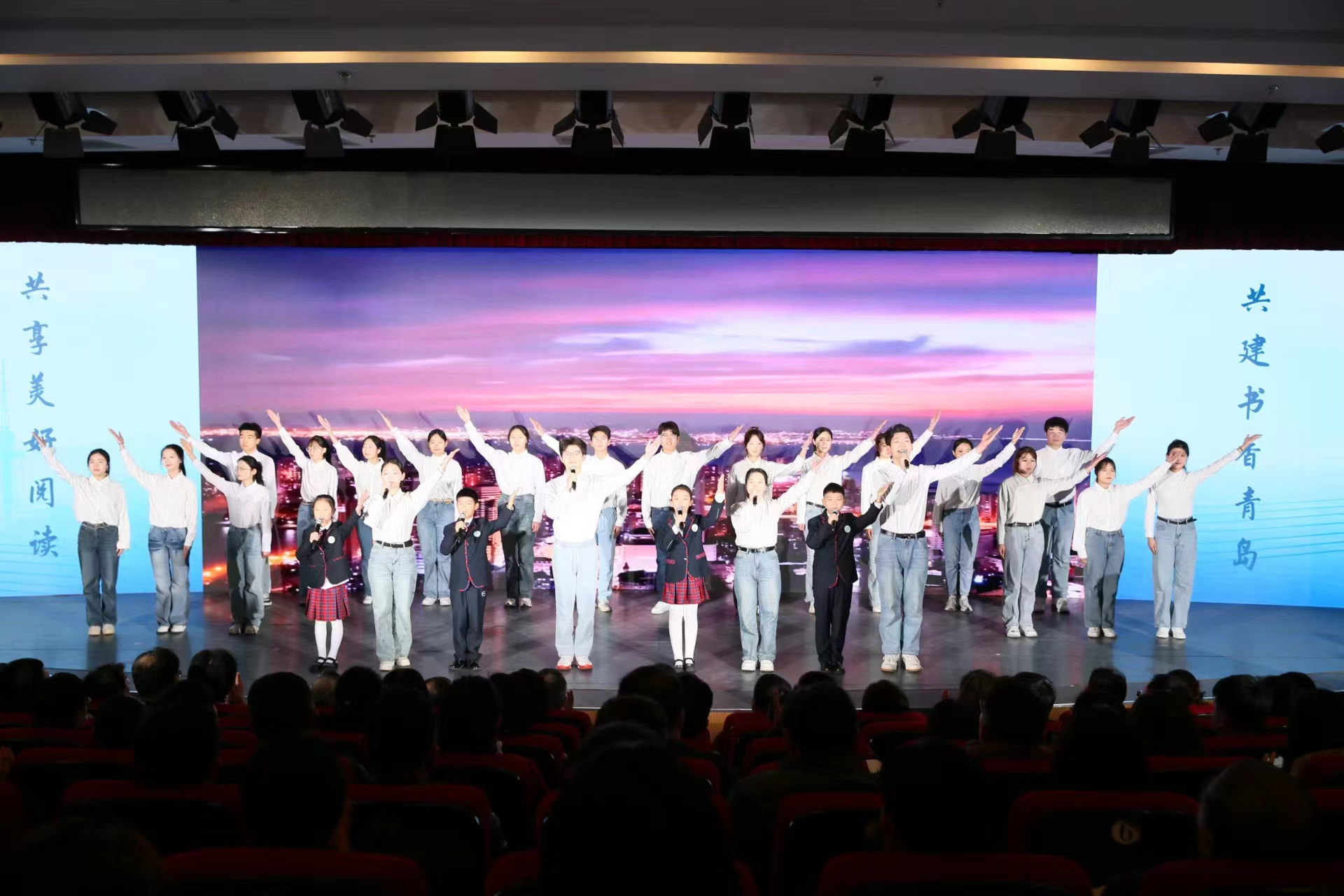 代表徐兴震,何京骏,张学瑞,王俊翰,刘耀泽,张峻琪,李玺辰,孙璇宁一同与“小小阅读推广人”活动获奖选手共同带来开场诗歌朗诵《青岛之书:打开蓝色的乐章》,演绎进程中,小学生们朝气蓬勃、神情专注,大学生们沉稳自信、意气风发,二者共同以饱满且深情的语调,展现了青岛这座城市对阅读的热爱与坚持。