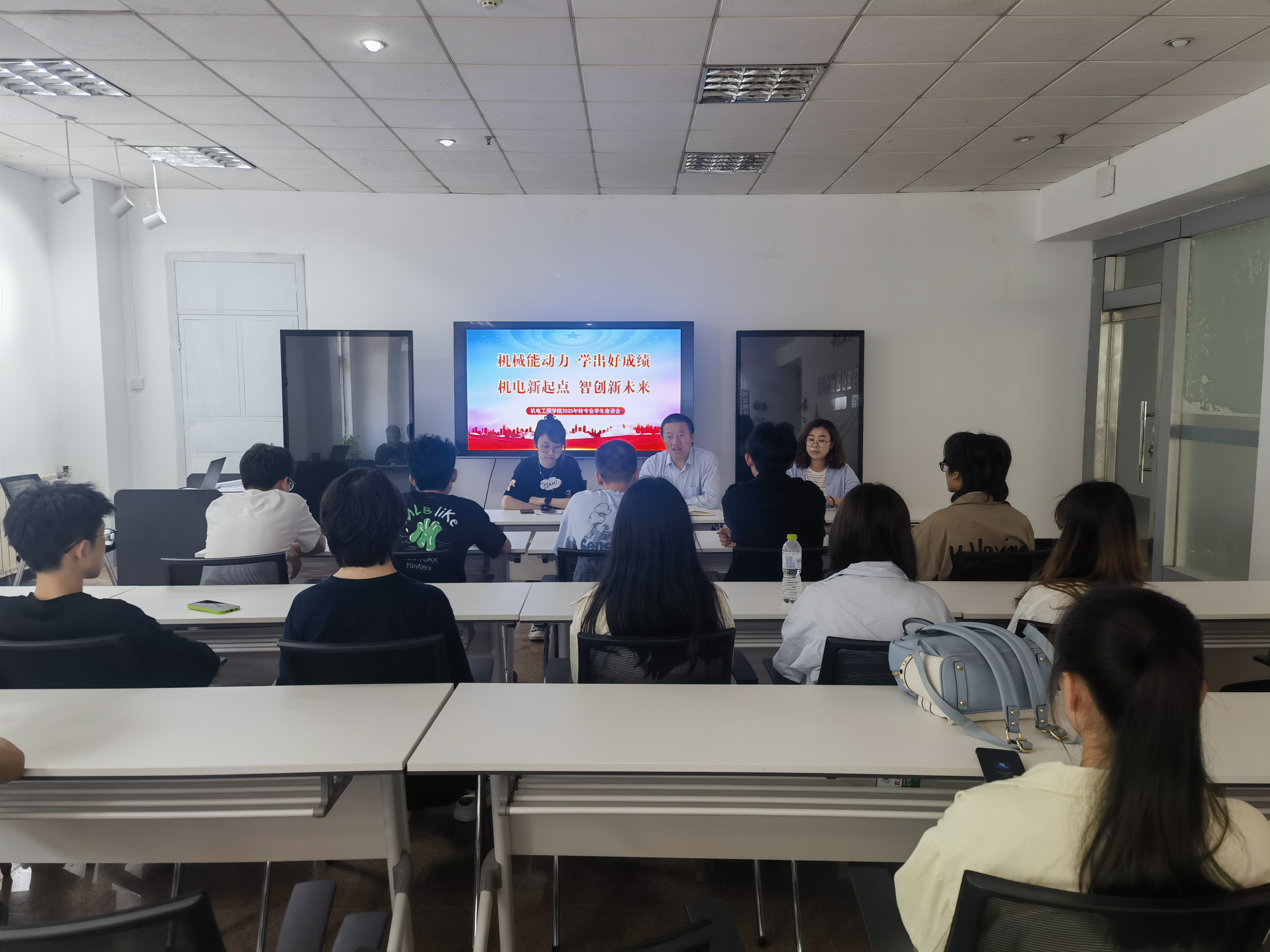 在自由交流环节,学生们敞开心扉,分享转入新专业后的适应性问题与思考,比如部分同学提及课程进度差异大、实验设备操作陌生等学业焦虑,也有同学坦言与新同学相处忐忑、时间管理压力增加等人际交往问题。与会老师们逐一记录问题,并现场提出意见建议,承诺“第一时间响应需求,做大家的贴心后盾”。