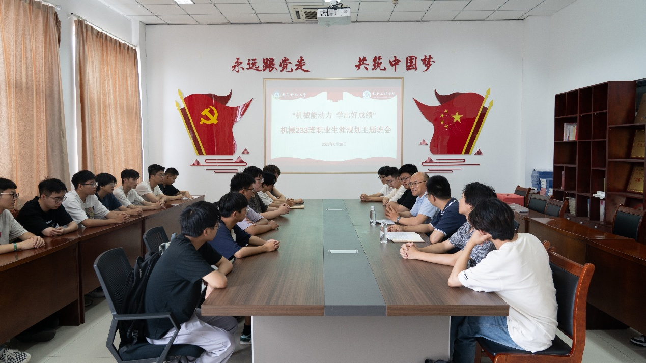 6月19日,机械233班“机械能动力、学出好成绩”主题班会在机电楼529会议室举行。离退休处党委书记丛松涛、辅导员杜康、机械233班全体同学参加主题班会。