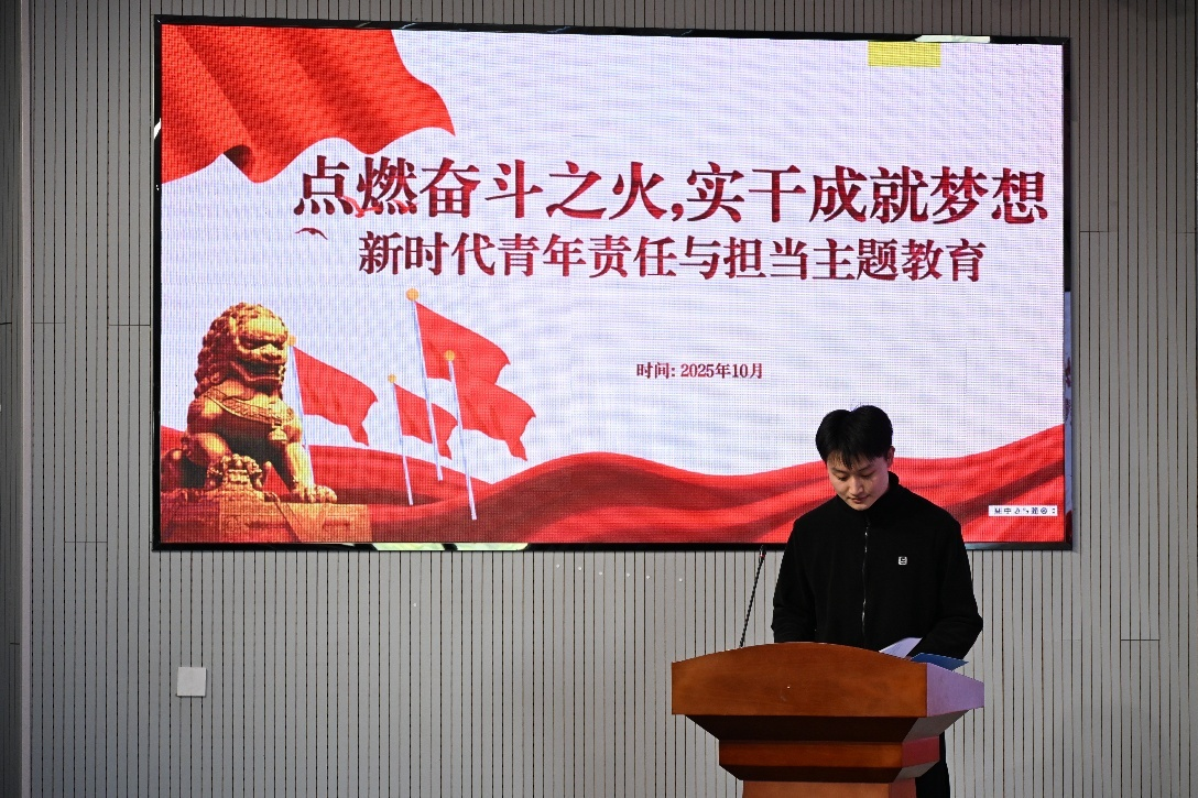 第四党支部副书记王成才同学首先以“点燃奋斗之火,实干成就梦想”为题,结合其服务师生、组织协调多项活动的实践经历,深刻阐述了新时代青年的责任内涵。他指出,坚定的信仰并非空中楼阁,而是扎根于每一次挺身而出、每一次尽职尽责的具体行动中。