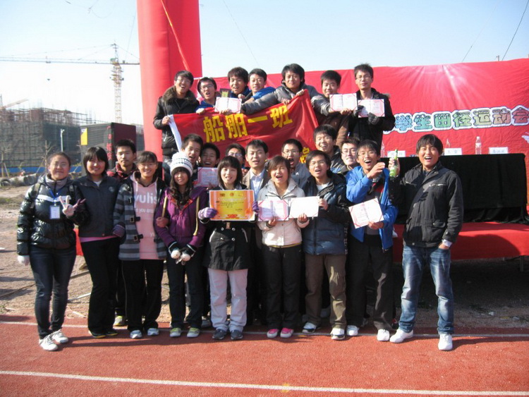 为了备战此次运动会,船舶111班的运动员们一个月前就开始准备,加强训练,有的运动员每天晚上都要坚持训练,风雨无阻,运动场上留下了他们深深地足迹,一分耕耘,一分收获,今天他们获得了丰厚的回报:王悦文同学获男子100米、4*400米、跳远三项冠军,朱爱珍获女子100米、女子200米两项冠军,其他同学也有出色的表现和发挥,均获得不错的名次。比赛现场,班级啦啦队阵容强大,齐声大喊,给运动员打气助威;后勤工作人员赛前赛后的端茶递水、擦汗上药,无微不至的关怀给了比赛队员无穷的动力;新闻小组的同学用激昂的文字表达自己的感情,现场赶写广播稿:“相信自己最棒的,无所谓成功与失败,只在乎那过程的挥汗如雨,你们努力,我们拼搏,共同筑起金色梦想。船舶一班的运动健儿们,勇敢的向着希望奔跑吧!船舶一,加油!”话语中鼓励、自信、安慰交织着,给了运动员无限的力量。