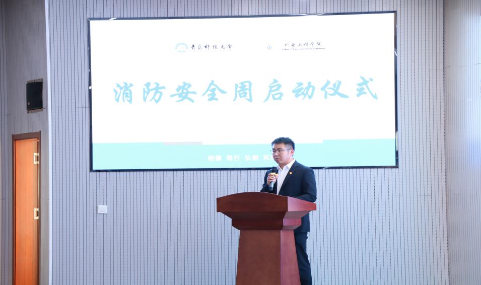 团委辅导员兼志工部部长胡福超老师与兼职辅导员邱健老师出席会议。活动邀请了青岛市崂山区消防大队宣传工作组韩雨凌、刘小楠、谢文隽、曹爽四位消防宣传员老师到场为同学们进行消防知识宣讲。