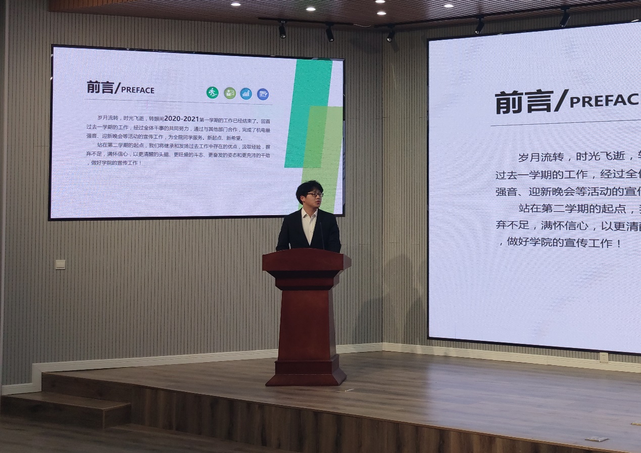 会议最后一项,学生会指导老师孙坤岩进行了总结讲话。孙坤岩老师首先肯定了上学期学生会的付出和成效,对表现优异的成员进行鼓励。同时指出了上学期学生会在工作中出现的不足,指导同学们提高对自身的要求,并提出了对本学期工作的规划和对学生会的新期望。